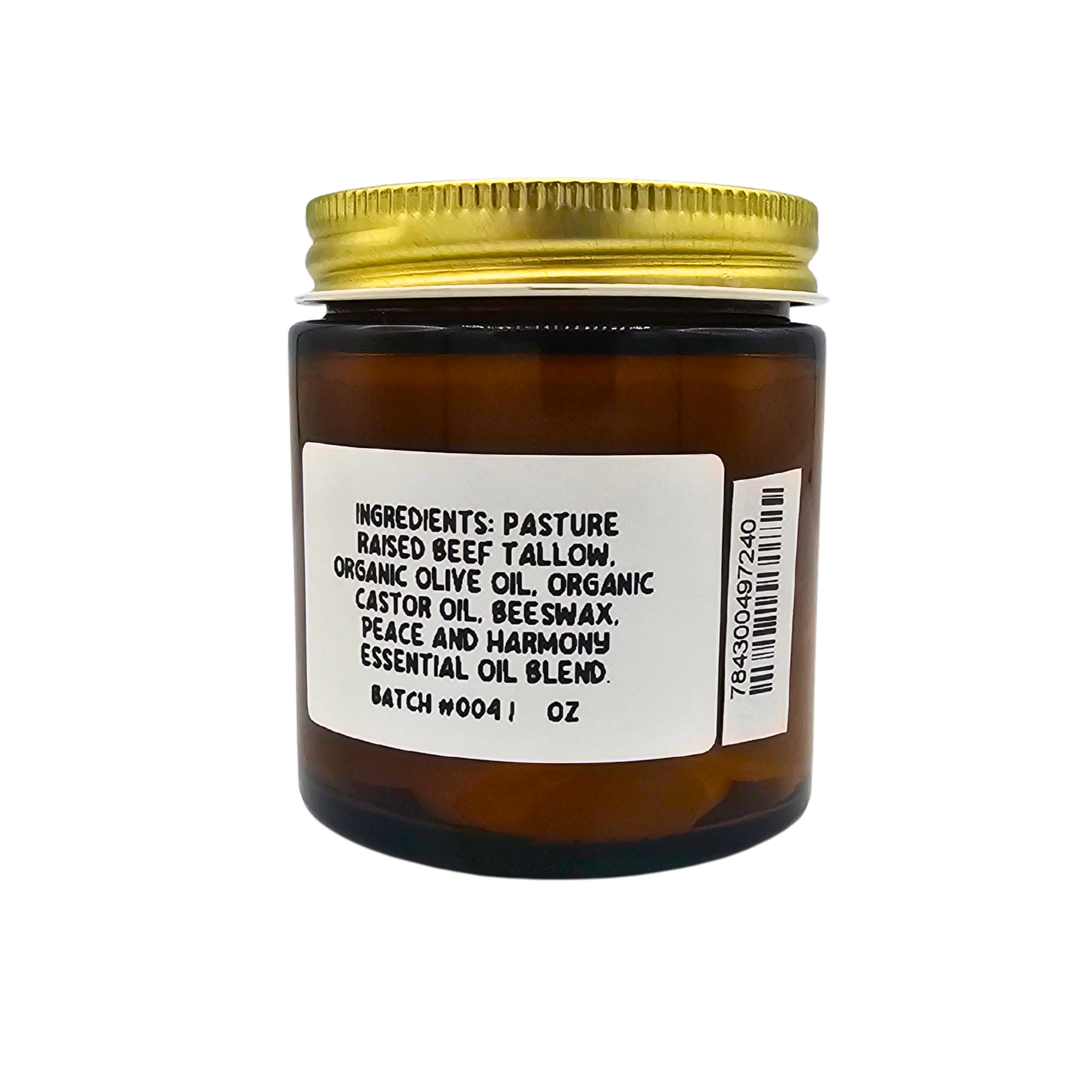 Ingredients: Pasture raised grass fed beef tallow, organic olive oil, organic castor oil, peace and harmony essential oil blend, (peppermint oil, patchouli oil, orange oil, lavender oil, basil oil) topped off with a dash of beeswax.