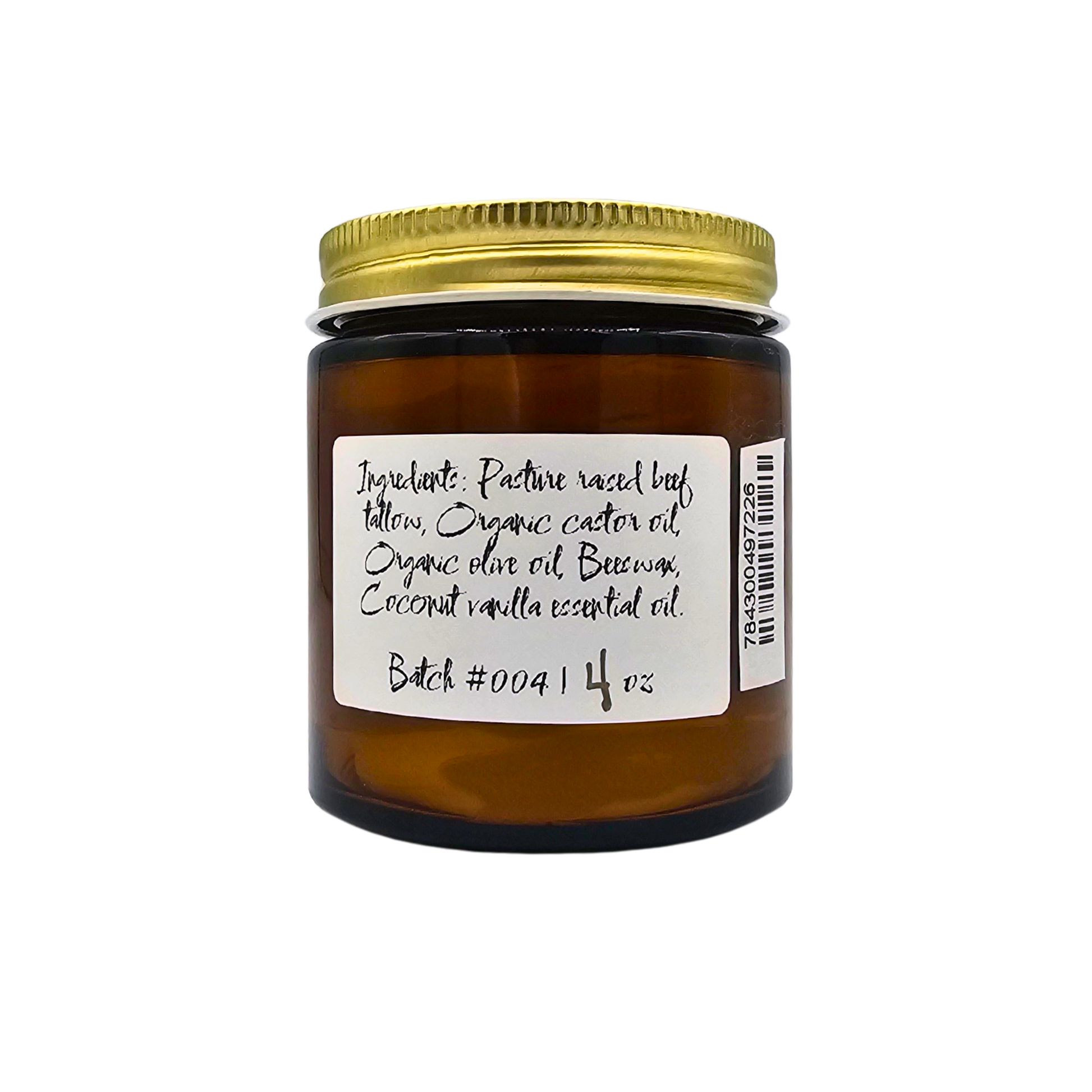 Ingredients: Pasture raised grass fed beef tallow, organic olive oil, organic castor oil, coconut vanilla essential oil.