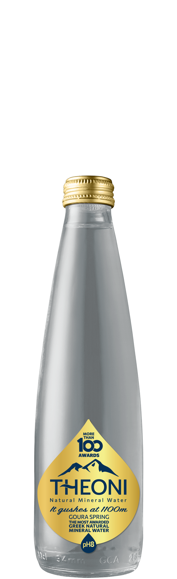 THEONI Natural Mineral Water gushes from the natural spring of Goura, at an altitude of 1100m, at the Agrafa mountain range in the prefecture of Karditsa In this pristine environment, far away from any kind of human activity, the water is bottled directly from the spring, without any impurities, additives or processing. In this way, it preserves its natural characteristics, making it the leading Greek Natural Mineral Water today with more than 100 International Awards for Quality and Taste.